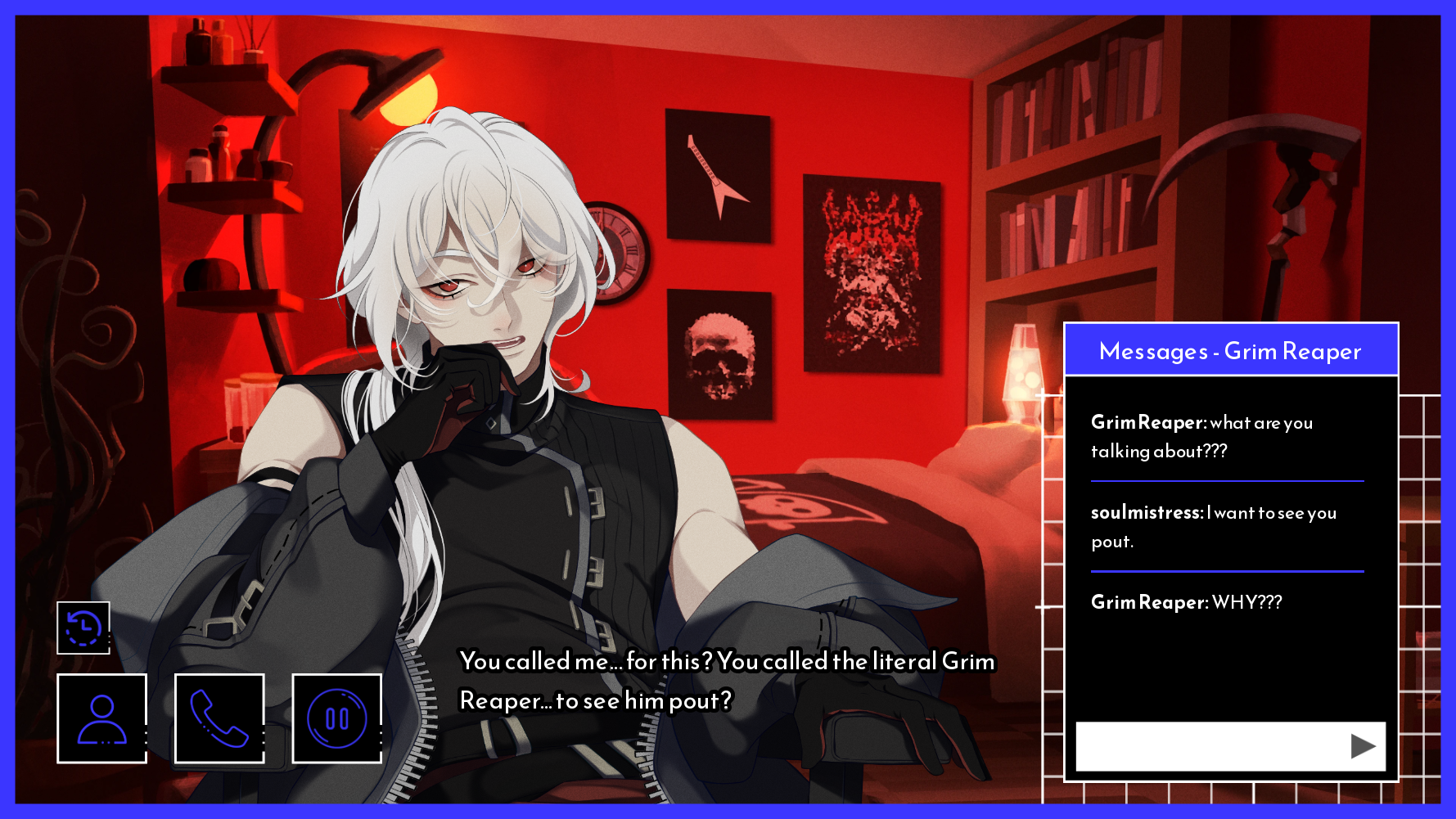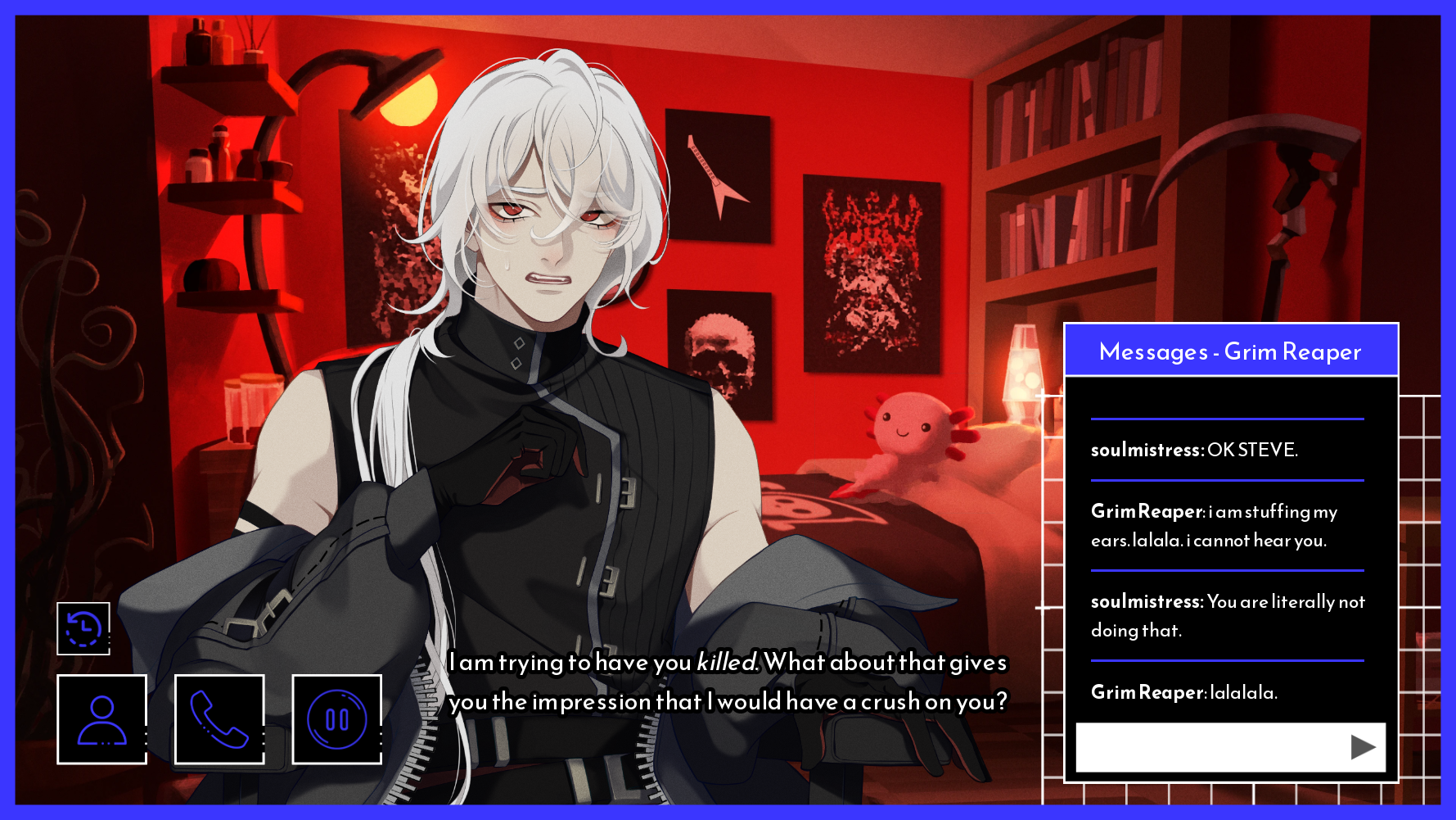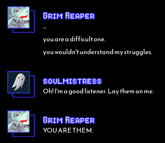 I love this conversation (also from early in the game—right before the soulbond stuff goes down and the MC realizes he's actually, genuinely the Grim Reaper).