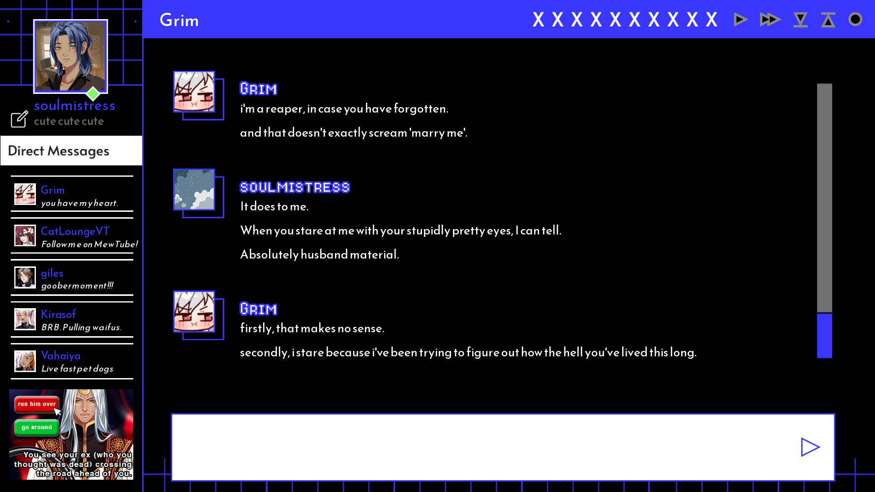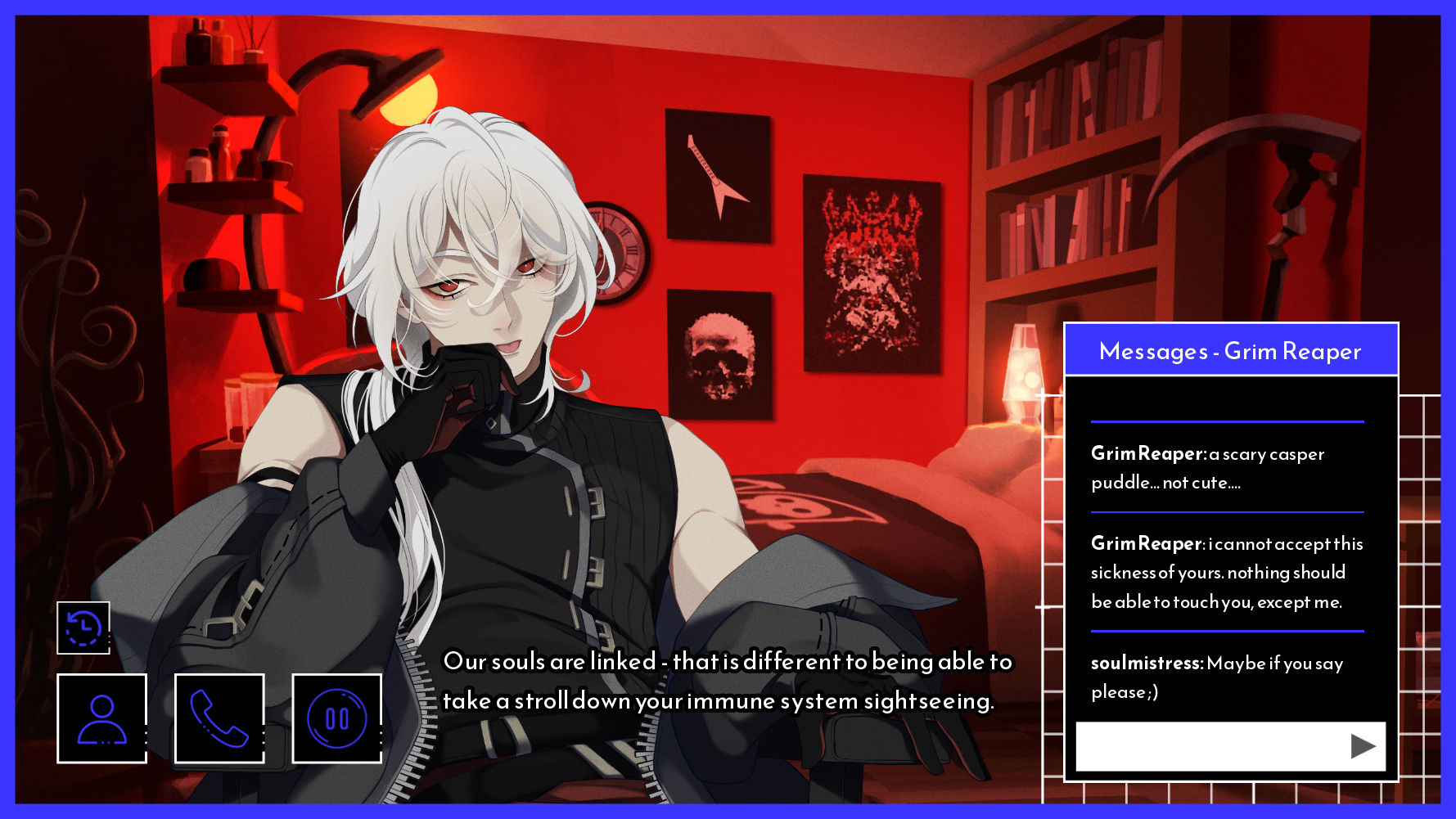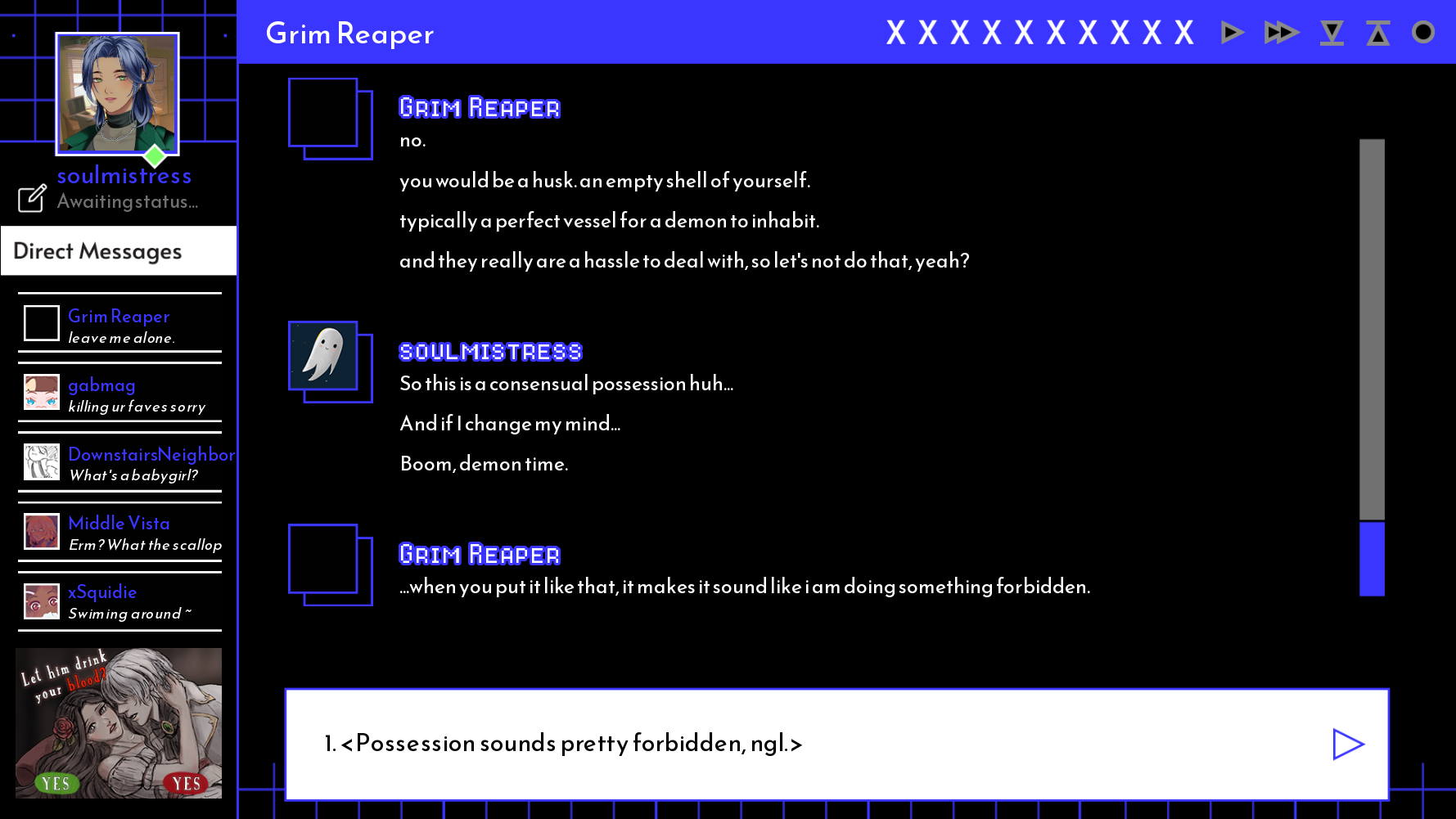 I love this conversation (also from early in the game—right before the soulbond stuff goes down and the MC realizes he's actually, genuinely the Grim Reaper).