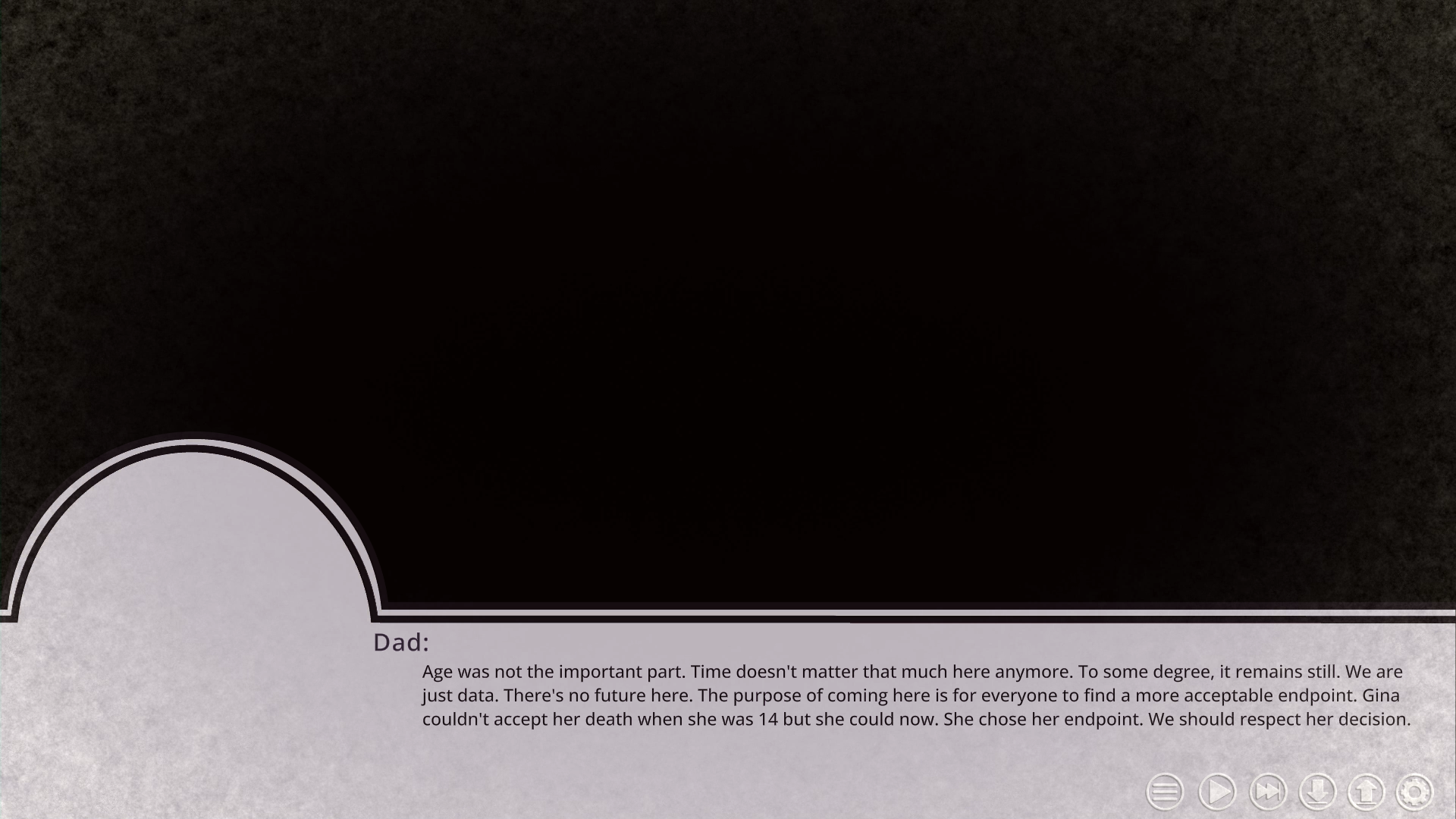 Nor does the game shy away from the actual moment of euthanasia. Gina enters Foreverland first, Ailsa second, and then her parents. Ailsa sees her sister’s corpse exit the machine after she’s been uploaded, before having to enter the machine herself with the knowledge that she’s about to die. And live on in a different form, yes. But it doesn’t change the fact that she, her physical flesh-and-blood body, and whatever existence that is contained within it, is about to die.